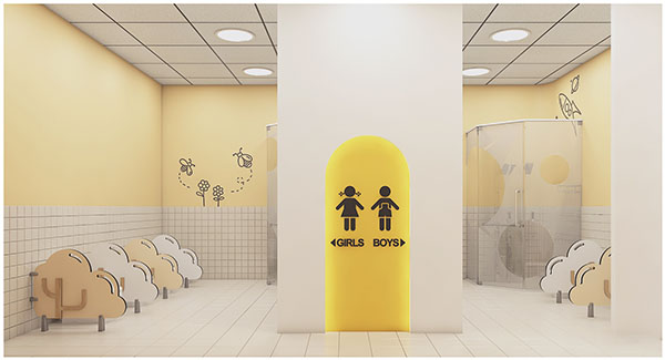 - Vách ngăn nhà vệ sinh với lớp học là kính để giáo viên dễ quan sát học sinh.